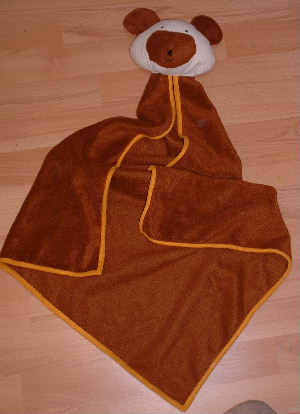 Formaat deken: 60 x 60 cm, bies is geel/bruin van kleur.