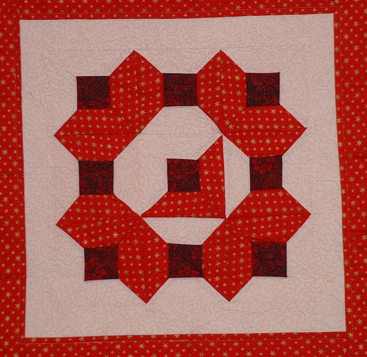 Kerstquiltje met ophangstrook aan achterkant. Met gouddraad doorgestikt. model 3 €20,- |